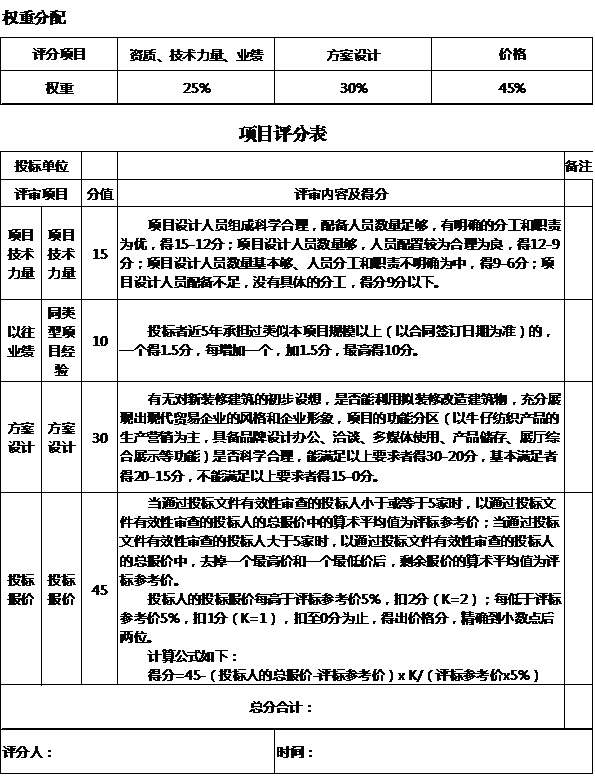 十三、本招標(biāo)項目以評分權(quán)重分配原則進(jìn)行評標(biāo),評分項目含有資質(zhì)、技術(shù)力量、業(yè)績,占比25%;方案設(shè)計,占比30%;投標(biāo)價格,占比45%。以綜合得分高者中標(biāo)。項目評分表詳見附件。